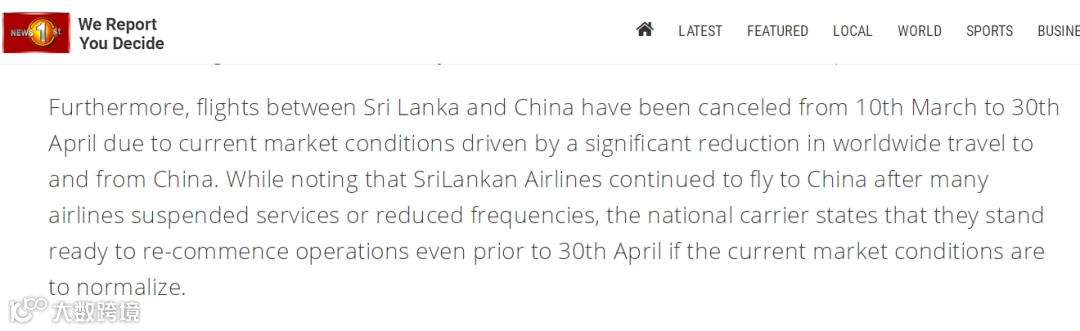 斯里兰卡航空计划取消3月10日-4月30日的中国-斯里兰卡往返航班。