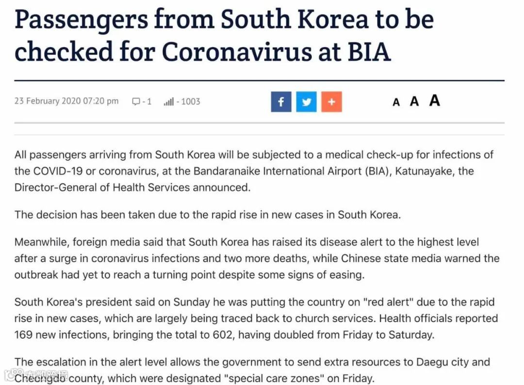 鉴于这个情况,斯里兰卡科伦坡国际机场对韩国游客入境变得更严格了,所有入境的韩国人都要接受针对新冠肺炎病毒的健康检查。