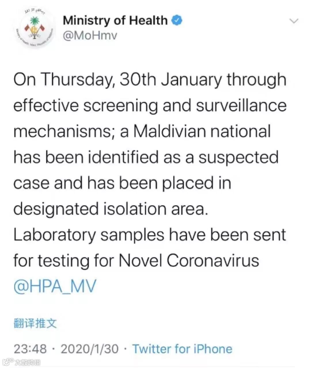 1月30日,马尔代夫当局确认马尔代夫出现新型冠状肺炎疑似病例,政府宣布暂停与中国直航航班,并出台与中方各航空公司的应急方案。
