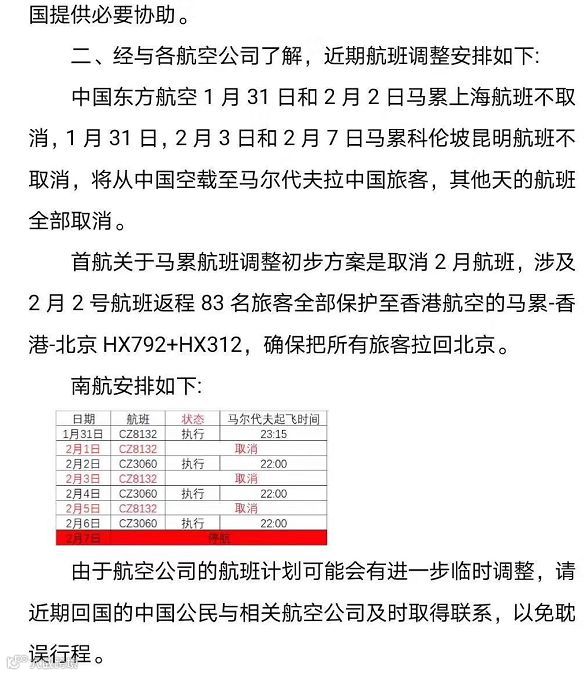 开始取消航班。同时,由于马尔代夫暂时禁止来自中国的航班入境,飞往马累的航班也被取消,恢复
