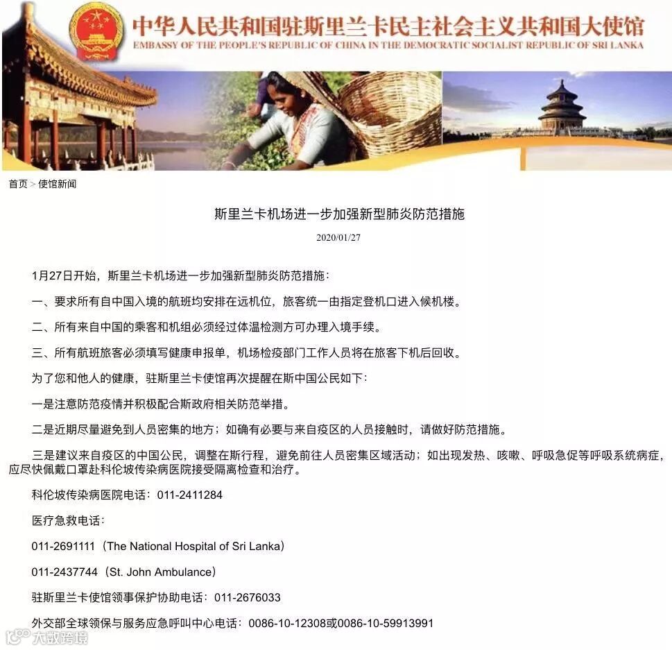 中国驻斯使馆官网27日发布的消息,斯里兰卡机场进一步加强新型肺炎防范措施,再次推送给大家: