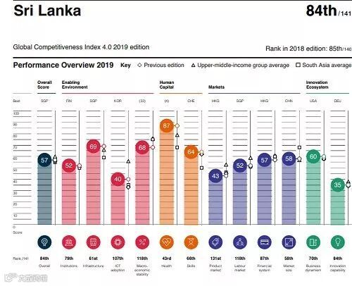斯里兰卡的综合得分为57.5,在世界141个国家中排名第84位,是南亚地区竞争力提升最快的国家,而印度则排在第68位。在南亚其他国家中,孟加拉国排名第105位,尼泊尔排名第108位,巴基斯坦排名第110位。