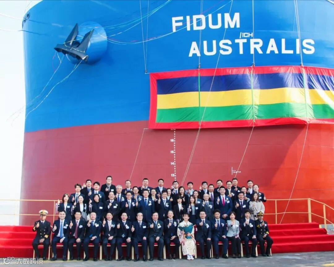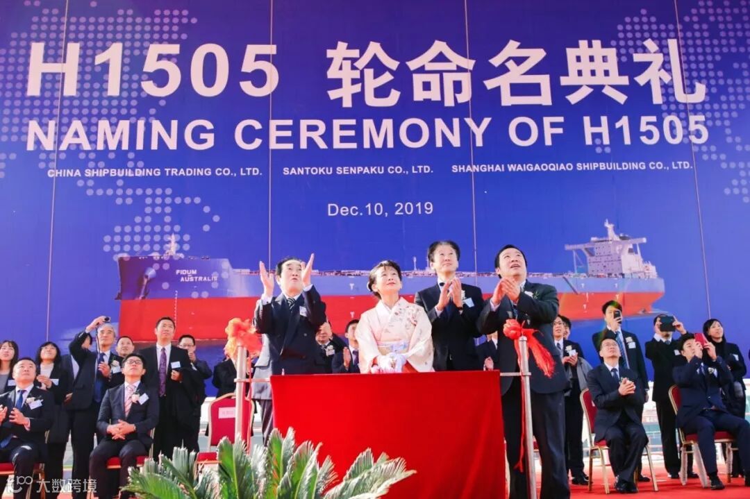 仪式上,日本三井住友信托银行理事、大阪总行营业部第一部长白岩启孝宣读命名词,白岩裕美子为新船剪彩。