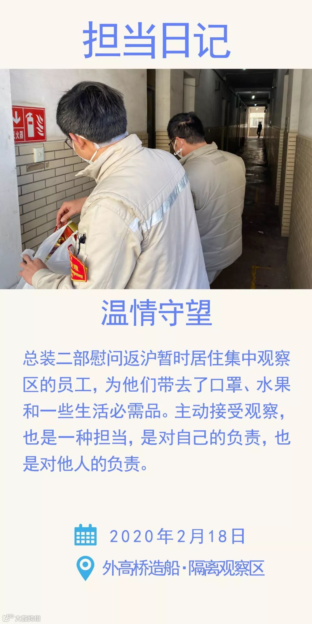 根据政府及公司对防疫工作的有关要求,公司设立了集中观察区。各部门返沪暂住观察区的人员还有很多。归来投身公司建设的兄弟姐妹们,虽然距离暂时远了,但公司对你们的关心却并没有因此疏远。