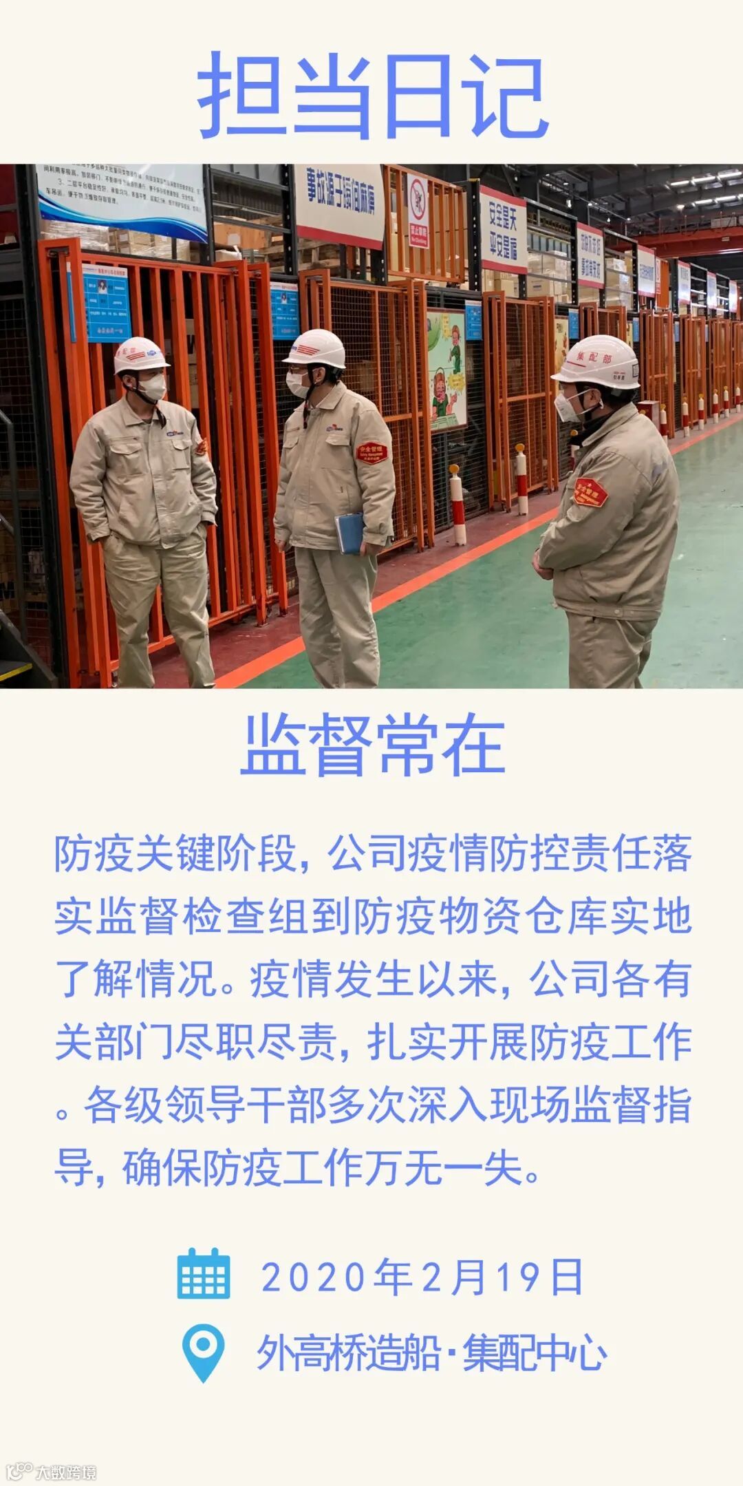 在公司的每个部门,都有这样一群人,他们敬畏又无畏,不放过每一个防疫中的细节,认真谨慎,同时也积极为恢复生产做着准备,干劲十足。
