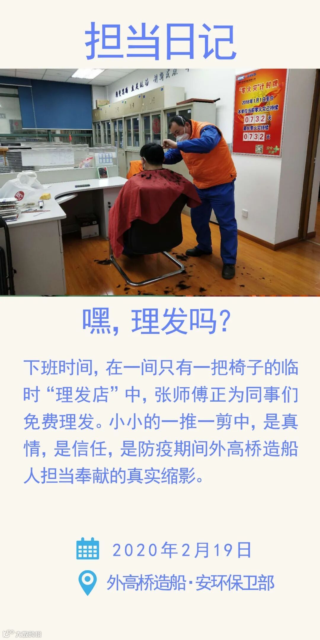 图中正在给人理发的师傅名叫张世年,是公司安环保卫部一名普通职工。因疫情原因,大多数理发店没有开张,理发成了大家的难题,得知这一情况,张师傅利用每天下班时间开起了临时“理发店”,给部门里有需求的同事提供免费理发服务。