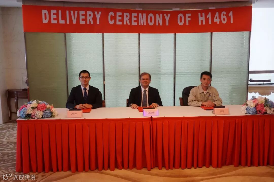 Anglo-Eastern技术服务公司 Vikas Widge、中国船舶贸易公司业务部五部商务经理姜宾彬、外高桥造船营销部副部长叶杰,分别代表船东方、中船贸易、建造方在协议上签字。