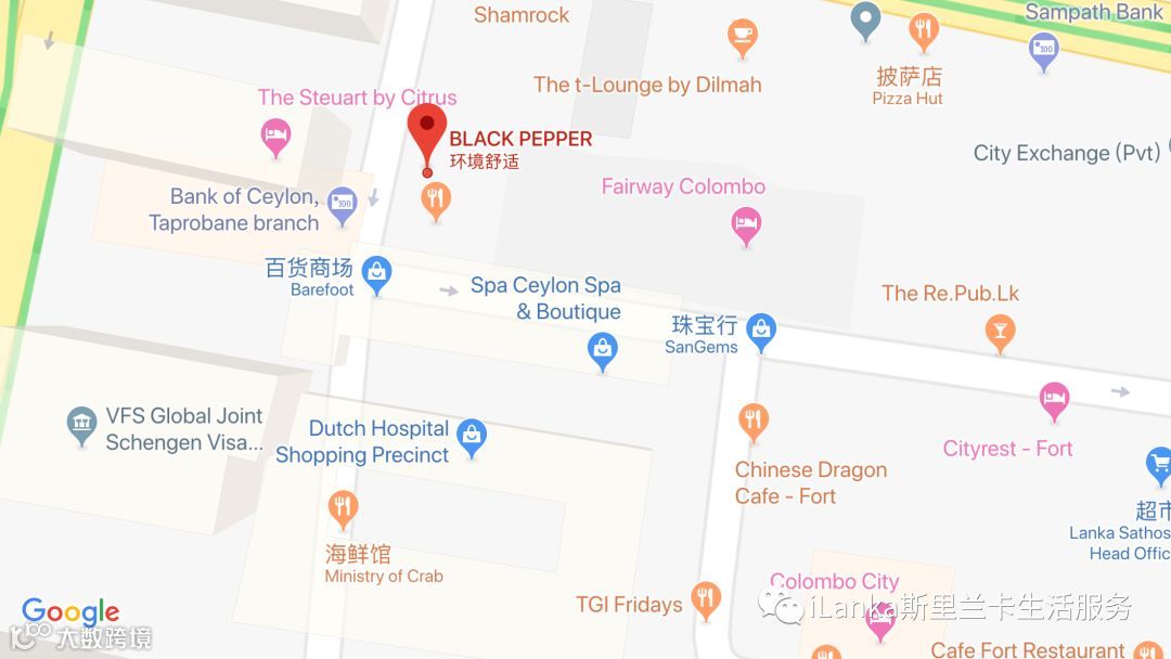 停停停!光顾着吃忘了介绍了,这家店叫做Black Pepper。对,就是上图的那个logo。这家店的位置非常非常好找。在Dutch Hospital里的Ministry of crab,大家都知道在哪儿吧?沿着螃蟹部径直往里走,穿过Dutch Hospital之后,看到汉堡王后,就到了,就紧挨着汉堡王的隔壁,正对着Steuart酒店。位置图,详见文末。