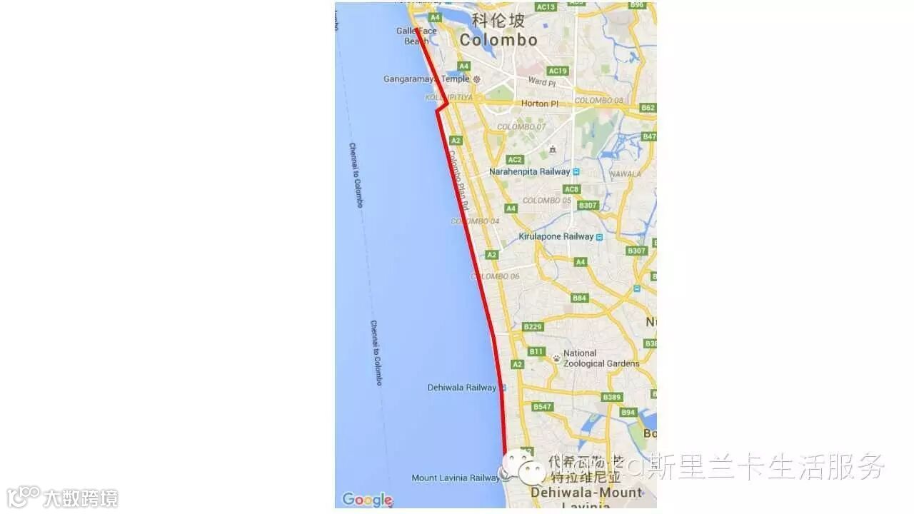 从Kingsbury酒店出发,沿着高尔路南下,这段路大概三公里,先后路过印度和美国大使馆,一直到Kollupitiya路口,此时向西拐到Kollupitiya火车站,沿着车站的铁轨一路向南,此时你的右手就是蔚蓝的大海以及传说中的海边小火车,大部分的时候会有火车从你旁边呼啸而过。外挂在车厢上的人们会冲你招手大喊“come on”或者“rush!rush!”