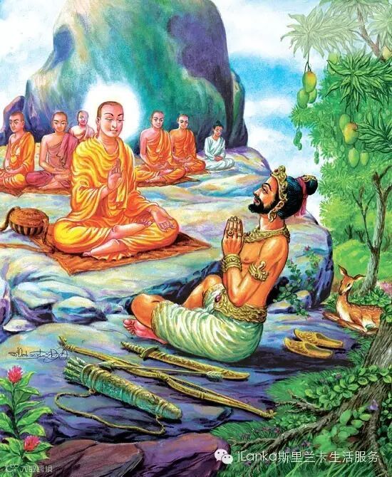 于是,摩哂陀阐扬三宝之道、皈依之法,以及出家修行的法门。王感到闻法的欢喜,由此皈依佛教,成为斯里兰卡历史上第一个佛教徒。