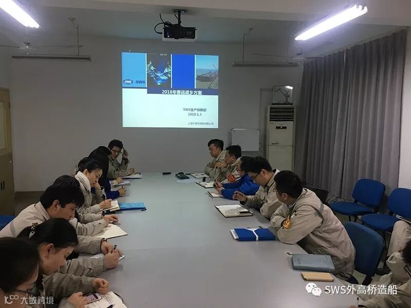 2018年1月3日15时上海外高桥造船有限公司春运启动会在生产保障部二楼会议室召开,会议主要内容有:回顾2017年春运开展工作、介绍2018年春运策划方案及计划、结合方案,相关协调工作讨论。本次会议由生产保障部召集,人力资源部、安环部、六大生产部门以及配套部、生产保障部、品质保证部、精度管理、科技管理部、工艺研究所管理室主任、人事员参加。