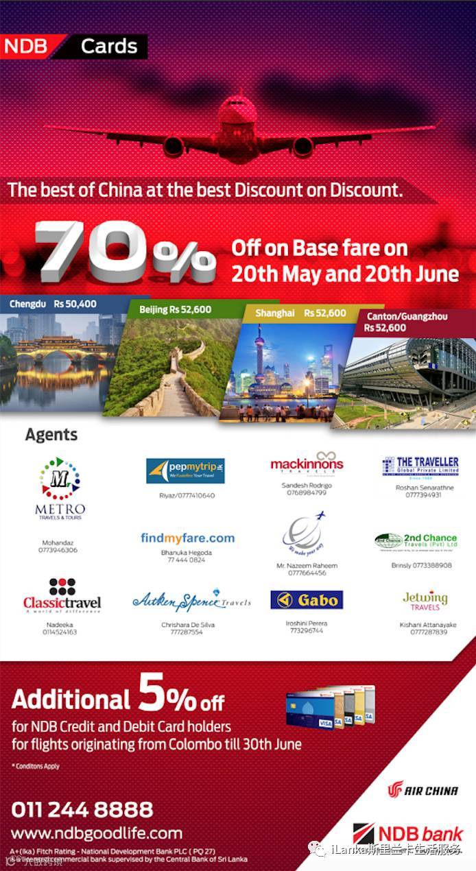 国航科伦坡营业部 or 上述代理处(本地旅行社)均可享受NDB银行卡优惠服务!