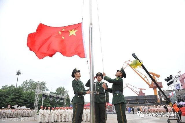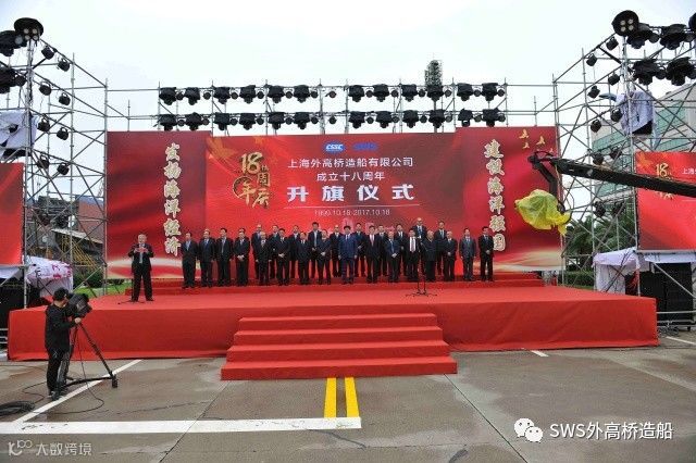8时18分,公司党委书记、董事长王琦宣布上海外高桥造船有限公司成立十八周年升旗仪式开始,旗手护送国旗、昂首阔步走向升旗台。在嘹亮的国歌声中,在现场全体人员的注目礼下,五星红旗冉冉升起,飘扬在外高桥造船的上空。