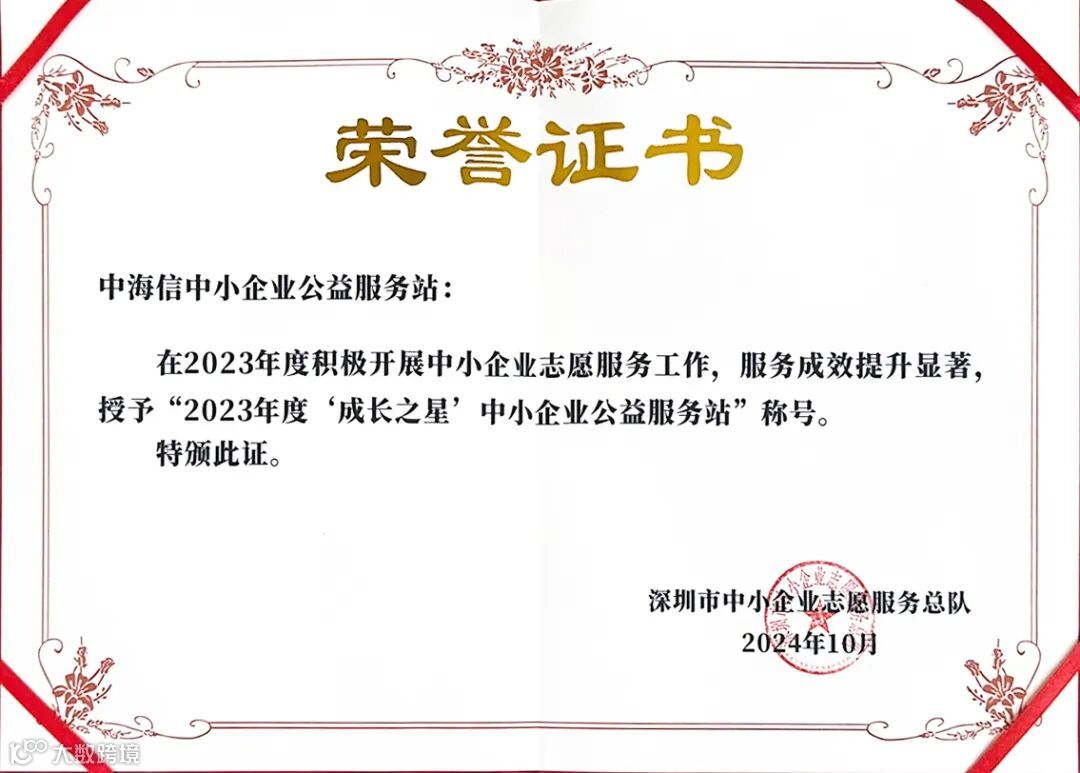 近日,深圳市中小企业服务局正式对外公布了 2024 年中小企业志愿服务支队以及中小企业公益服务站的名单。在此次评选中,中海信中小企业公益服务站表现优异,经过志愿服务总队全面、细致且严谨的综合评估,中海信服务站从众多参评单位中脱颖而出,荣膺成长之星荣誉称号。