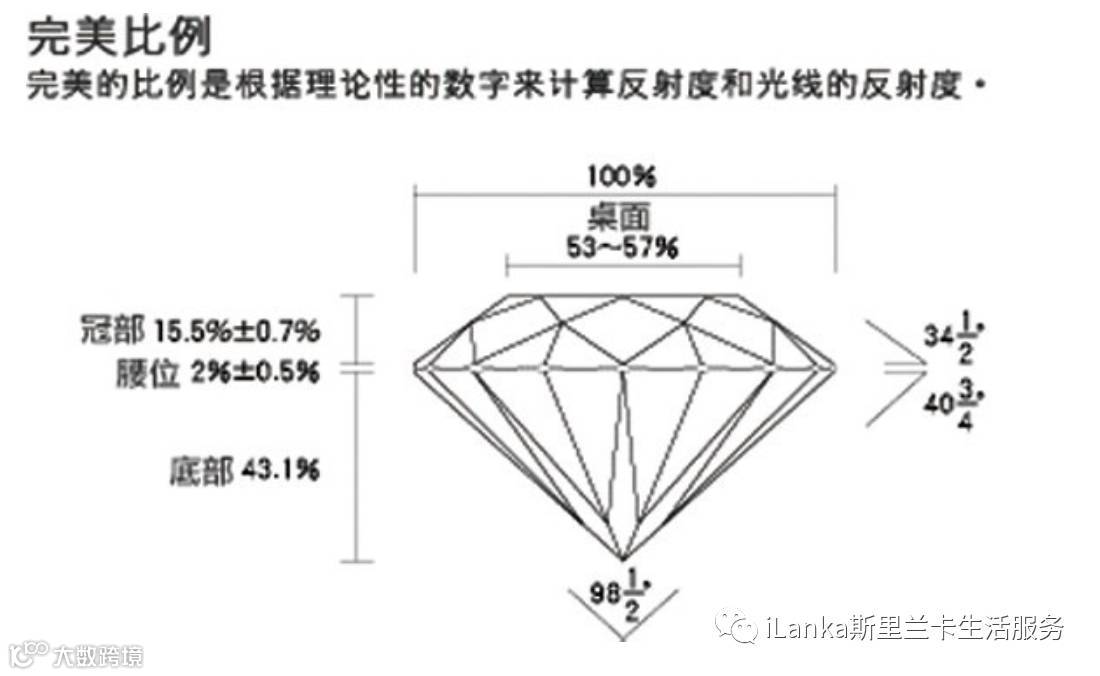 以上为宝石切割各部分的名称,同时也附着宝石切割最完美的比例数据。我知道要各位记住这些数据非常难,谁也不是天天看这些的。所以只要记得各部位名称即可。当切割宝石时没有按照这个比例,就会出现对宝石火彩的影响。