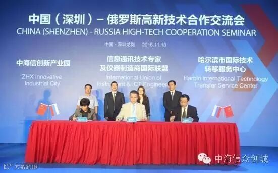 11月18日下午,由深圳市投资推广署、龙岗区人民政府主办的“中国(深圳)- 俄罗斯高新技术合作交流会”活动在龙岗区中海信创新产业城举行,通讯技术及仪器制造商国际联盟、哈尔滨市国际技术转移服务中心、中海信创新产业园签订三方战略合作协议,促进中俄两国(莫斯科、哈尔滨、深圳三地)联合创新平台落户龙岗,由此深圳中海信创新产业城成为龙岗第六列国际直通车。