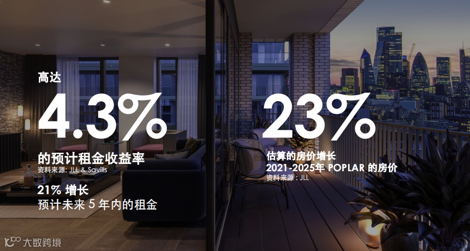 金融城的溢出效应—据房产机构JLL的资料显示,未来三年Poplar Riverside的房价增长达23%,而联合Savills的预估,Poplar Riverside的未来租金收益达4.3%,未来5年的的租金收益累计达21%。