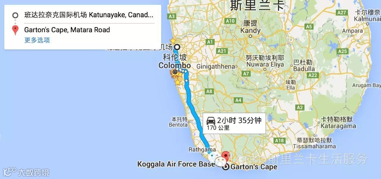 从科伦坡国际机场出发,到达Garton’s Cape Hotel(Denuwala, Ahangama, Sri Lanka)全程约2.5小时。