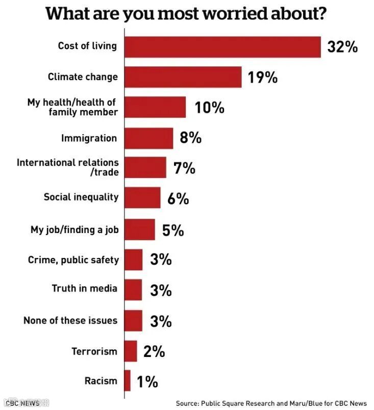 这份全国性的调查时间是从5月31日到6月10日,受访者多达4,500名加拿大人。其中涵盖了合资格的选民,新移民,首次投票者,以及原住民。然而,加拿大担忧的事情远远不止这么多,根据这份调查显示,加拿大人的烦心事至少有11项。