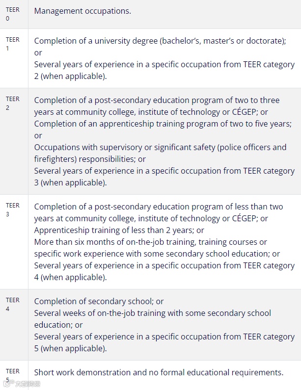 3级:在社区学院、技术学院或CÉGEP完成不到两年的专上教育课程,或少于2年的学徒培训,或在职培训6个月以上的,或具有指定的工作经验以及中学学历,或或在4级的特定职业中拥有多年经验。