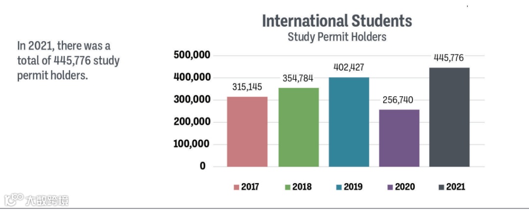 数据显示,2021年,加拿大共向各国留学生签发44.5万学生签证,人数创下历史记录;同时有40.6万人拿到加拿大移民签证,其中中国移民3.1万人,与疫情前相比,人数并无明显变化。