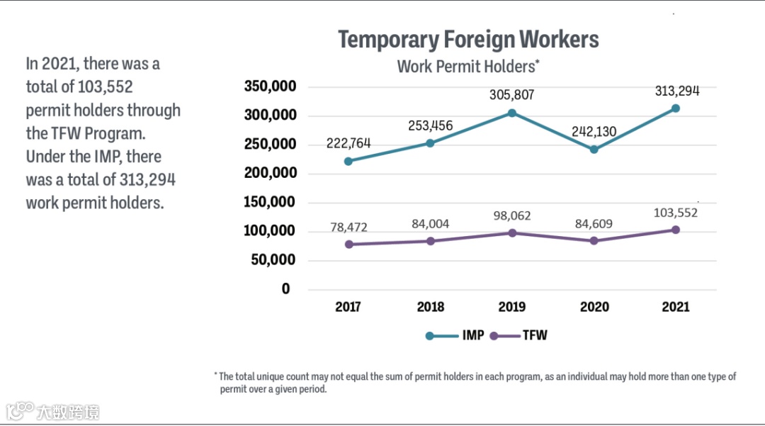 临时工作签证方面,2021年全年,加拿大共签发313,294份IMP和103,552份TFW签证。