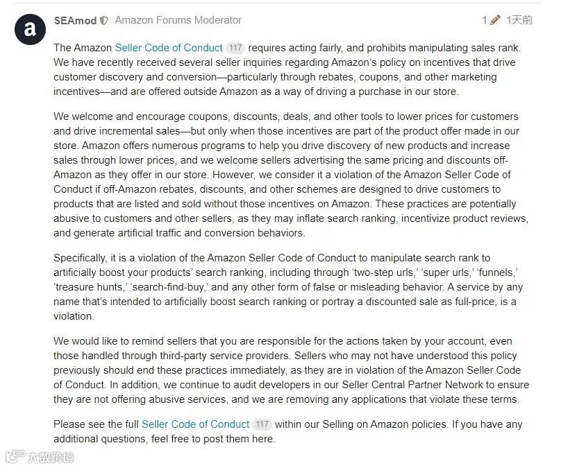 究其原因是,最近亚马逊收到了几位卖家关于亚马逊激励顾客发现和转换政策的询问,特别是通过折扣、优惠券和其他营销激励的使用准则。