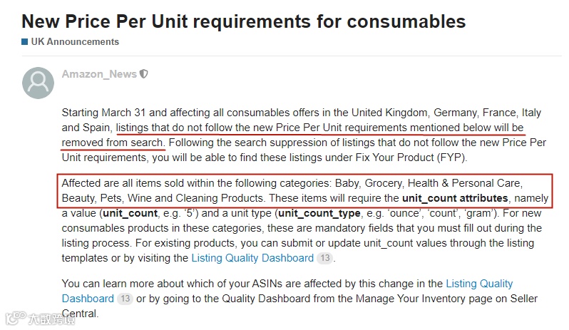 据悉,亚马逊在卖家后台发布了一则公告,公告称:从3月31日起,英国、德国、法国、意大利和西班牙的所有消耗品中,要求卖家必须为这类产品填写重量和每单位售价,未填写的产品将从搜索结果中删除。