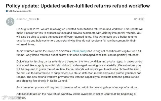 同时,亚马逊欧洲站也发布公告称,8月将更新欧洲站自配送卖家的退货退款政策。