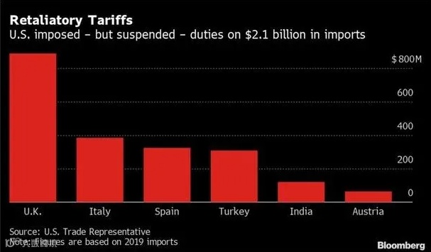 就在前两天,美国宣布将对来自6个国家、总价值约为21亿美元的商品收取25%的报复性关税。包括英国、意大利、西班牙、土耳其、印度和奥地利。