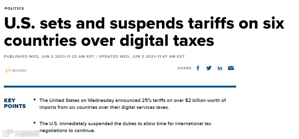 美国贸易代表称,此举动是因为这几个国家向美国科技巨头征收歧视性数字服务税,报复性关税是数字税的反击。惩罚性关税将在 180 天后落实,在此期间美国贸易代表和各国的谈判人员会继续磋商细节,来决定最后的关税落地与否。