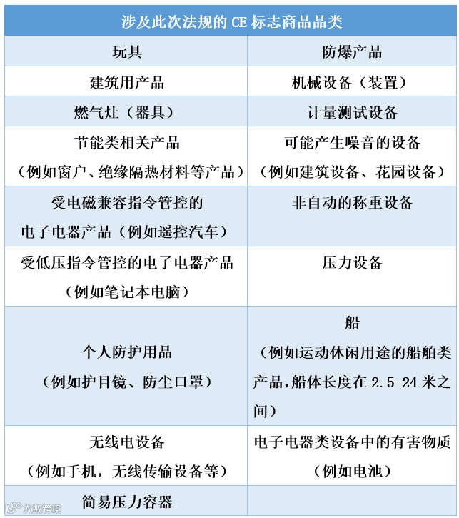 相关规定显示,除医疗器械、民用爆炸物以及某些升降机和索道装置外,所有带有CE标志的商品均适用于该法规要求。(具体商品品类卖家可参考下图进行对照。)