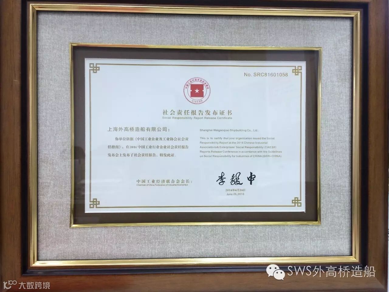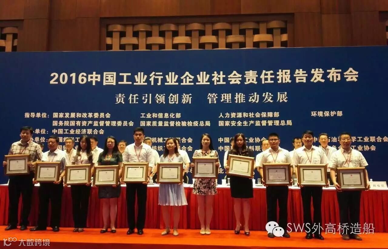 6月26日,外高桥造船作为唯一一家船舶制造企业,同国家电网、三一重工等百家单位于北京国家会议中心参加“责任引领创新,管理推动发展——2016中国工业行业企业社会责任报告发布会”并领取发布证书。全国政协常委、经济委员会副主任、中国工经联会长李毅中,工信部副部长冯飞,国家安监总局副局长李兆前等领导出席会议。