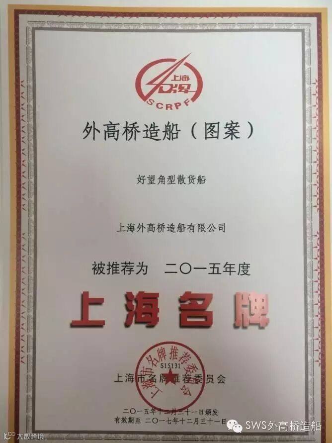 近期,公司收到上海市名牌推荐委员会办公室颁发的“好望角型散货船”和“自升式钻井平台”两张名牌证书。这充分证明了公司产品在技术、质量、管理水平等各个方面均得到了市场的认可。