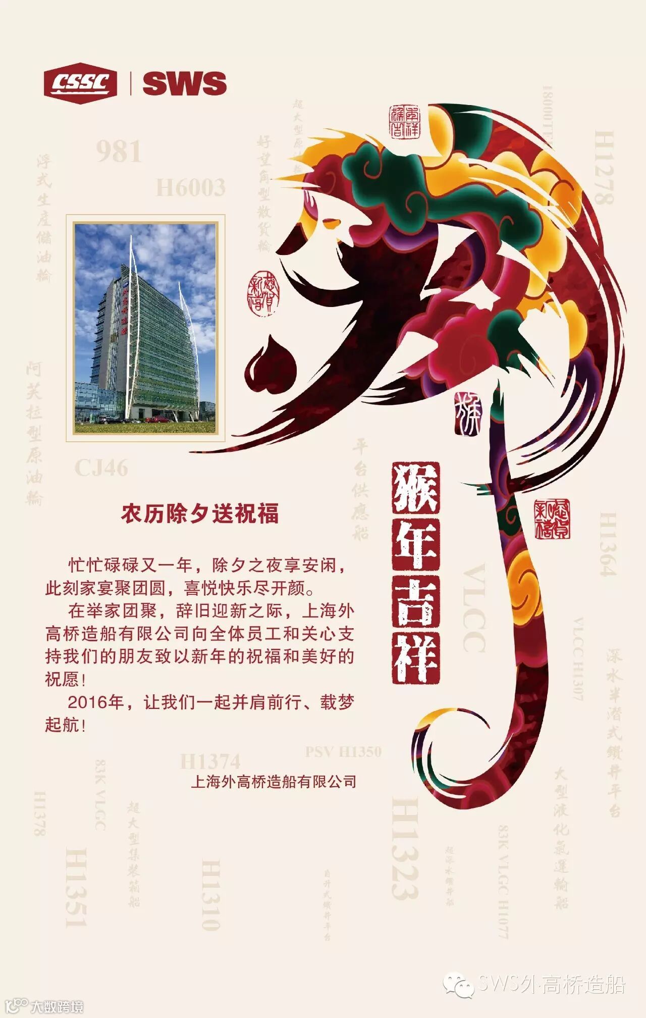 导读:上海外高桥造船有限公司向全体员工和关心支持我们的朋友致以新年的祝福和美好的祝愿!