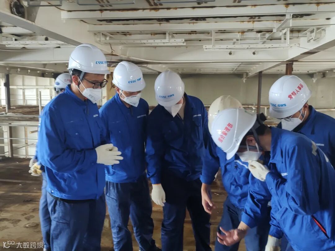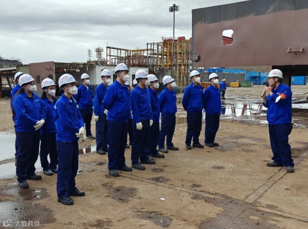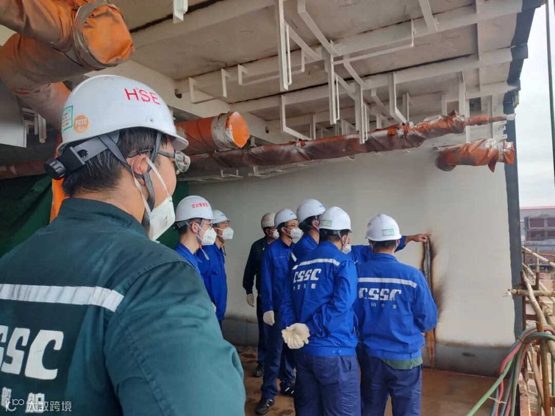 在学习现场,品质精度部和模块部项目主管从PCTC产品特点和建造难点、50E/F总段生产运行和工艺执行情况等方面,全面地讲述了项目组利用上建薄板建造经验控制结构变形,多方协作、合力克服多层甲板高精度控制难题,大力推进精益生产的建造历程。帮助青年进一步把握了公司重点产品的建造流程,了解了薄板的拼焊控制难点、吊装过程核心及控制要点、火工及焊接等热输入的工艺要求、精度控制基准及标准。经过现场安全培训教育后,青年们分批次走进总段,并结合学习内容、现场情况,和带队导师进行了深入交流。