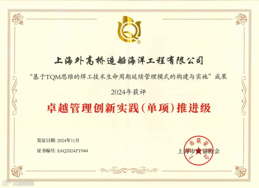 为进一步推动提升产业质量竞争力和企业质量管理水平,助力上海市新质生产力加速形成和现代化产业体系建设,上海市质量协会基于卓越绩效管理等先进质量管理理念、模型、方法,开展了2024年上海市卓越管理创新成果评价活动。公司品质精度部申报的《7000TEU机舱总段异地建造完整性质量管理实践》和《基于TQM思维的焊工技术生命周期延续管理模式的构建与实施》两项创新成果,分别荣获优秀级和推进级荣誉。