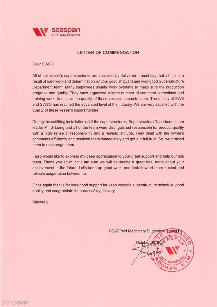 在表扬信中,Seaspan项目组对上建建造团队的奉献表达了敬意。信中提到,上建团队以精益求精的态度,确保了该船上建部分的高质量完工,其专业精神和精湛技艺给船东留下了深刻的印象。在处理船东提出的意见和建议时,上建团队更是展现出了高度的责任感和务实的作风,赢得了船东的充分信任和高度评价。