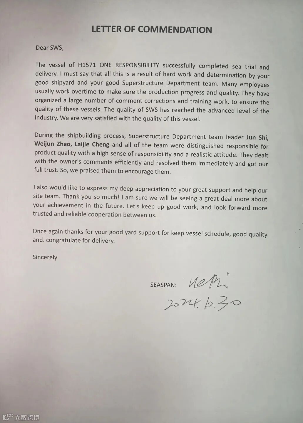 近日,外高桥造船为Seaspan精心打造的最后一条7000TEU集装箱船“ONE RESPONSIBILITY”轮顺利交付。在该系列船的圆满收官之际,公司模块部上建团队收到了来自驻厂Seaspan项目组的2封表扬信。