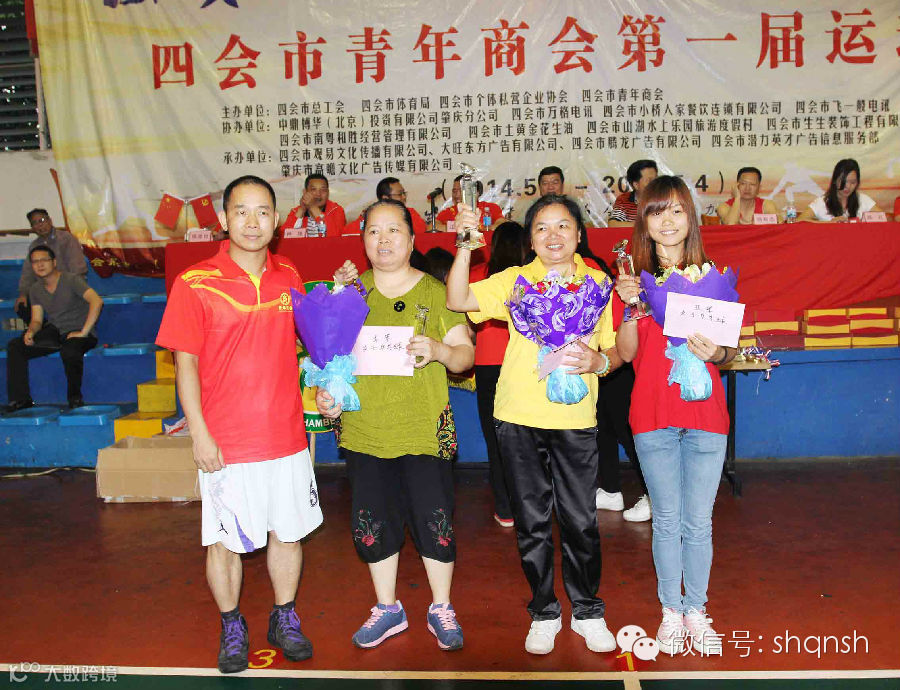 3、女子羽毛球单打:亚军陈永梅(左边、安家置业)、冠军黄艳芳(中间、南粤和胜)、季军刘芯兰(右边、青年商会)