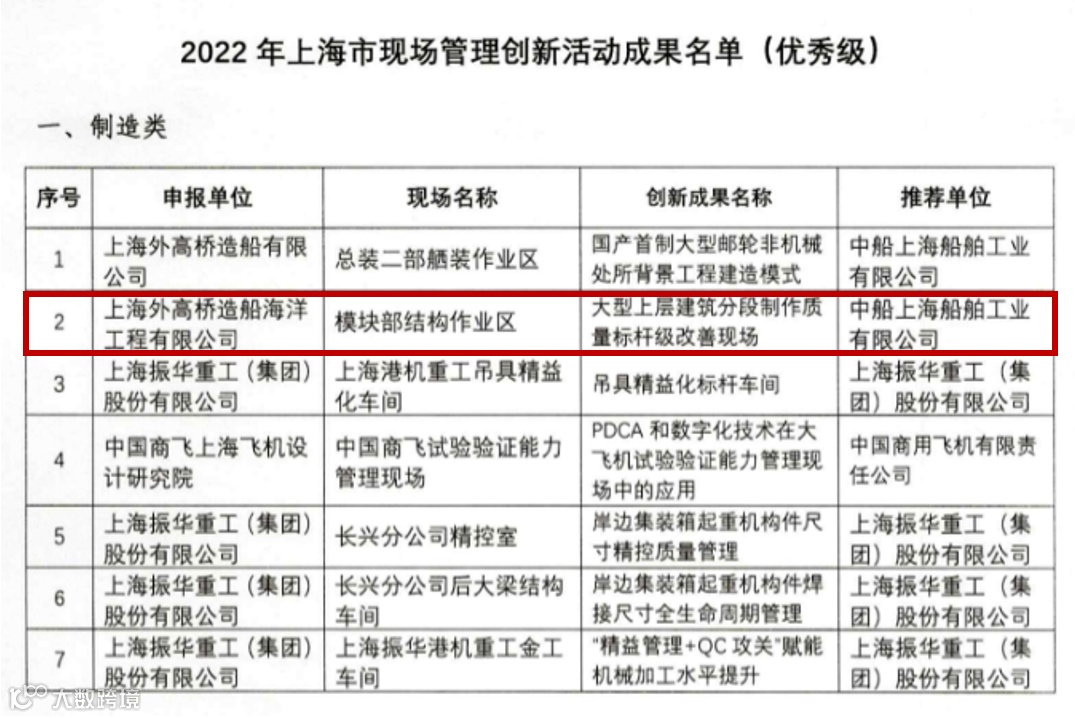 1月19日,上海市质量协会印发了《关于发布2022年上海市现场管理创新活动成果的通知》,公司模块部结构作业区创新实践成果“大型上层建筑分段制作质量标杆级改善现场”荣获“优秀级”荣誉称号!