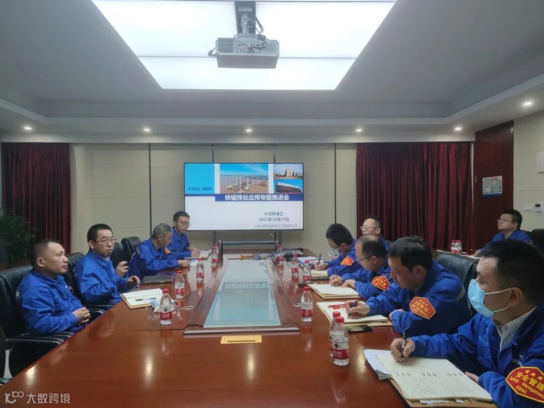 制造部、模块部汇报铁锚焊丝使用进展及后续推广计划,技术部、配套部和品质精度部从焊接工艺、现场质量效果、设备改善等方面做交流。