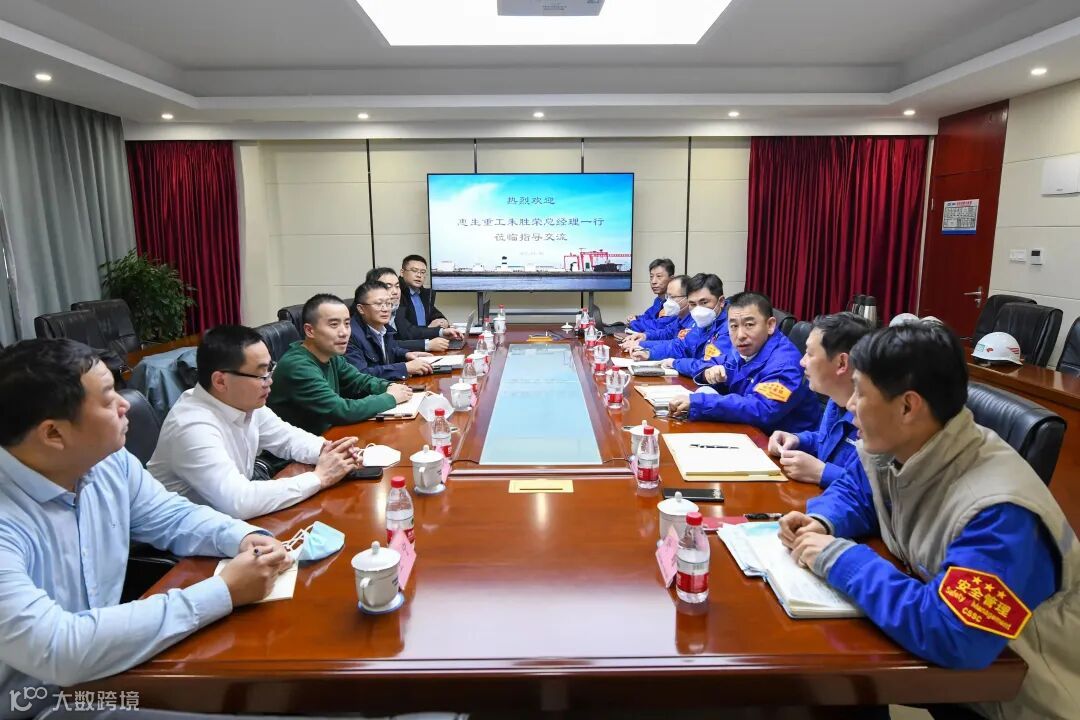 近日,惠生(南通)重工有限公司总经理朱胜荣一行到公司进行交流调研,公司党委副书记、总经理王金成,总经理助理李逵及相关部门负责人参会。