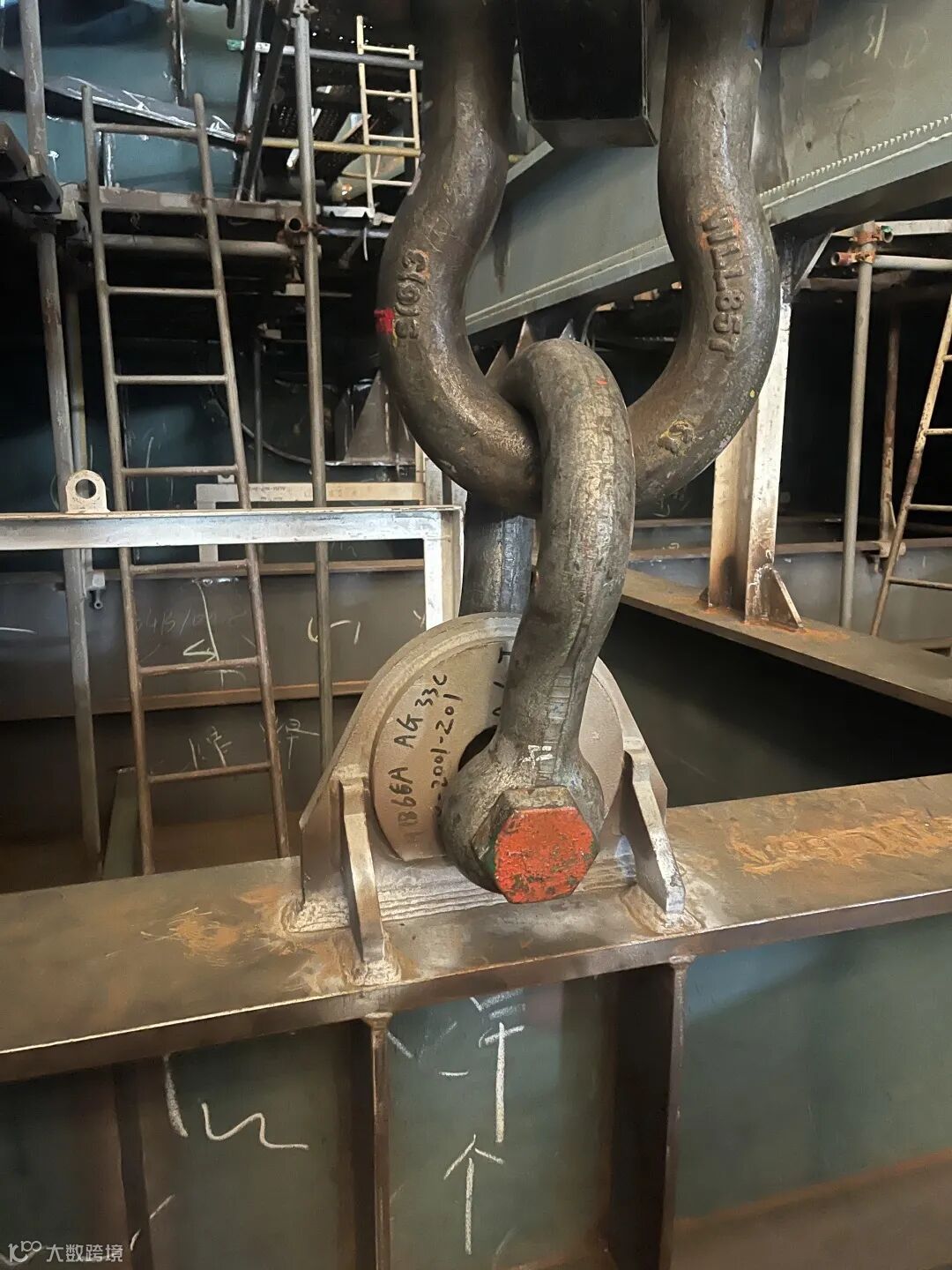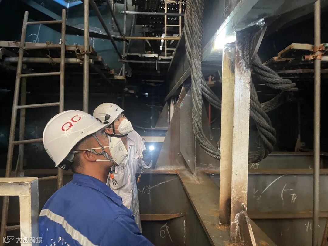 拉力试验按照既定流程进行,在船东、船检、QC三方见证下,起吊梁在66T试验负荷下静态保持了5分钟。随后,现场人员对试验后的起吊梁进行了仔细检查,核实吊梁结构是否存在损坏或者永久变形的情况,以免影响后续使用。在对比试验前后吊梁直线度及连接焊缝MT检测数据的基础上,最终判定该机舱起吊梁符合载重和精度要求,可以正常使用。试验当天还对多个机舱吊耳开展了拉力测试,结果均满足工艺要求。
