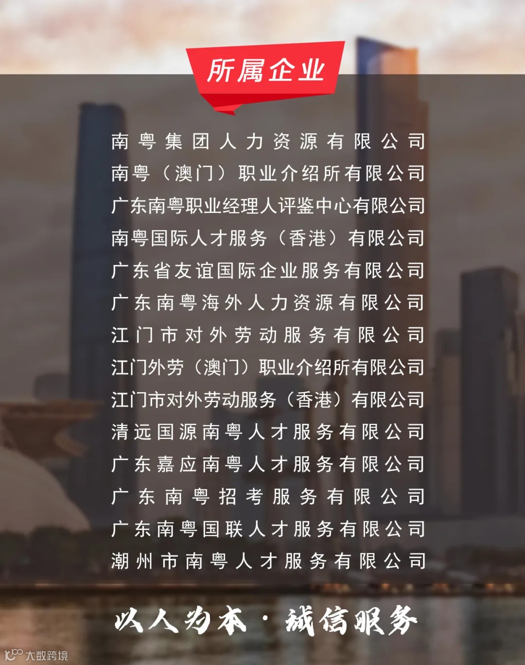 公司从事高端人才咨询、人才评鉴、招聘考试、输港澳劳务、海外劳务输出、国内劳务派遣、劳务外包、劳务承揽、服务外包、灵活用工等业务,为企业和个人提供优质人才服务
