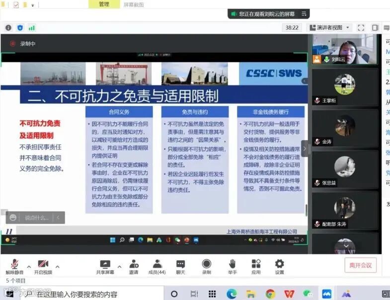 随着公司全面复工复产的脚步加快,6月2日,公司组织开展了一期主题为“疫情下商务合同风险管理与应对”的线上培训活动。培训由综合管理部主办,各合同业务部门共47人参加,共同为应对因疫情可能引发的法律风险而努力。