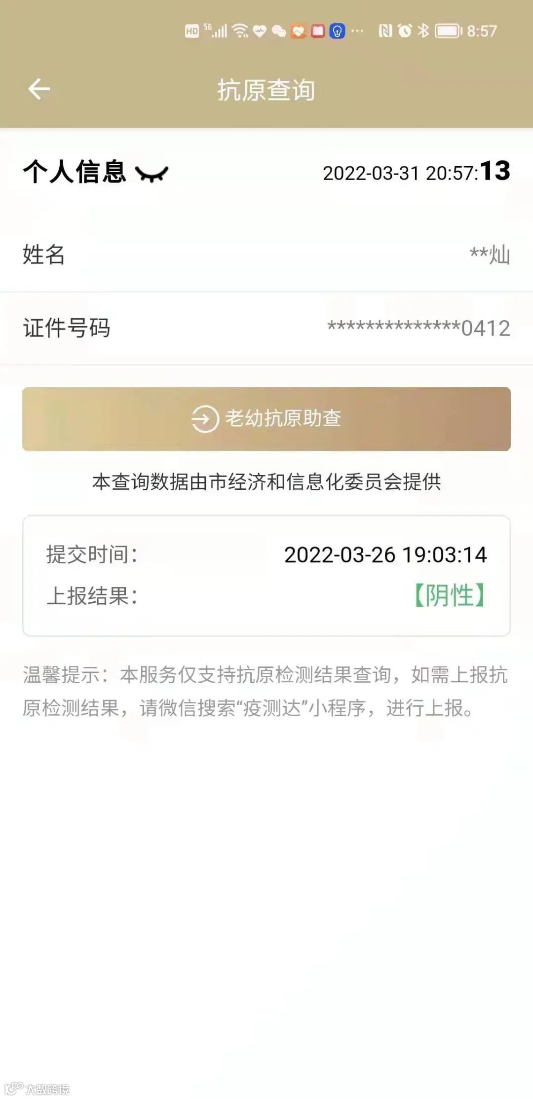 注意:支持查询18周岁以下,60周岁及以上人员的抗原检测结果查询,且仅显示最近一条。