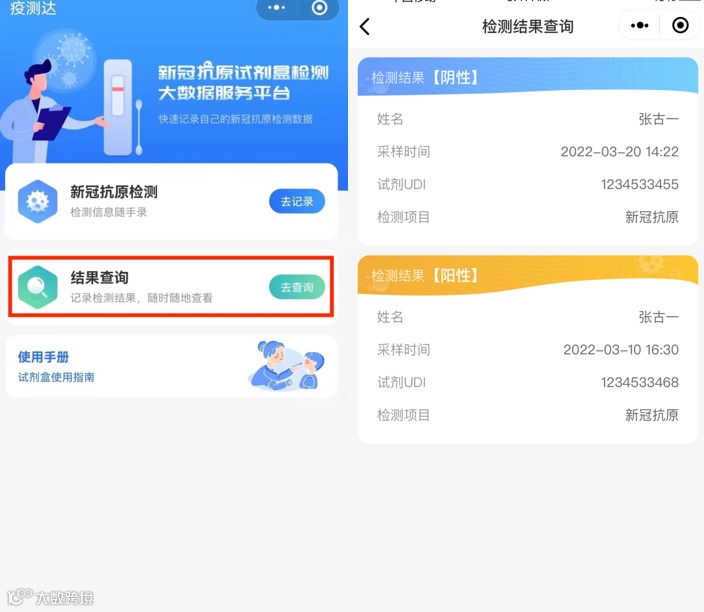 方式二:在“疫测达”小程序中,点击“结果查询-去查询”。