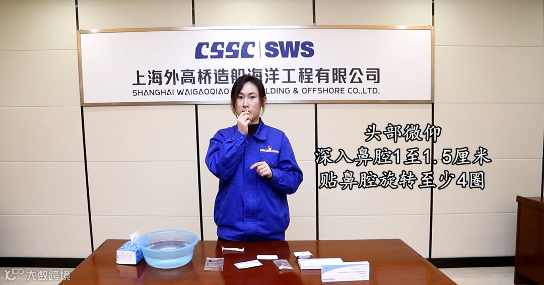 头部微仰,一手执拭子尾部贴一侧鼻孔进入,沿下鼻道的底部向后缓缓深入1-1.5厘米后贴鼻腔旋转至少4圈,对另一鼻腔重复相同操作。