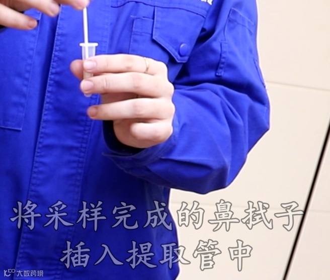 把这个试管的密封膜打开,将采样完成的鼻拭子插入提取管中